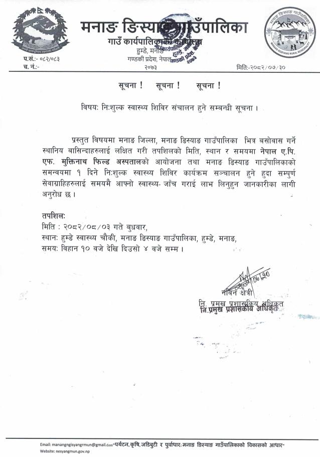 निःशुल्क स्वास्थ्य शिविर संचालन हुने सम्बन्धि सूचना ।