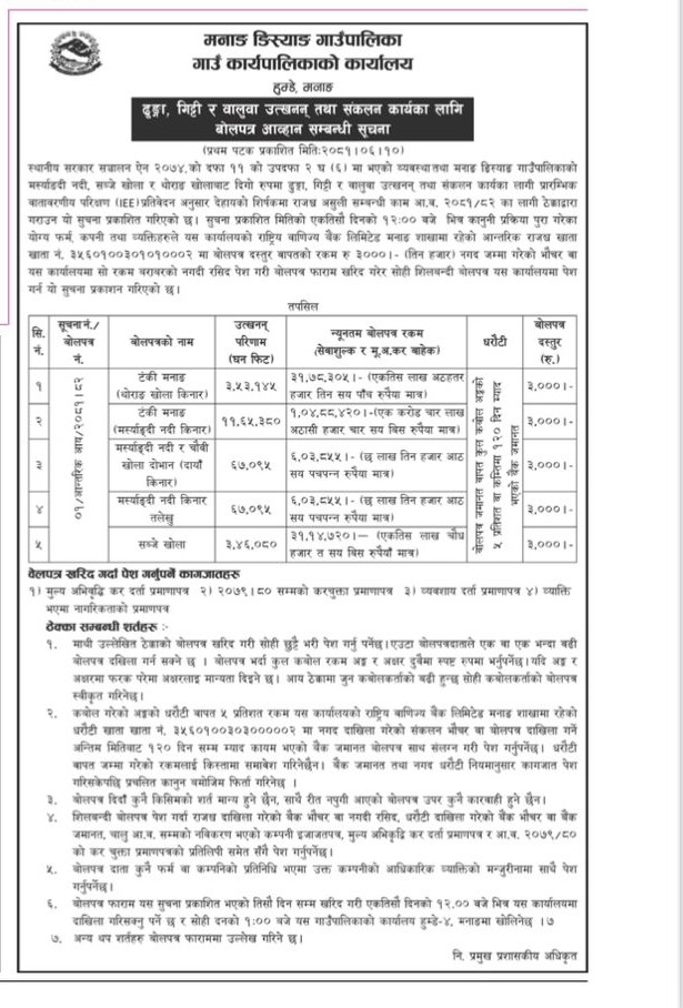 » ढुङ्गा, गिट्टी र वालुवा उत्खनन् तथा संकलन कार्यका लागि बोलपत्र आव्हान सम्बन्धी सूचना।